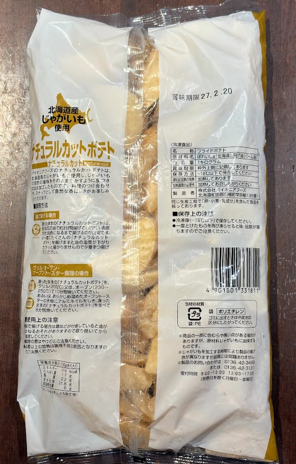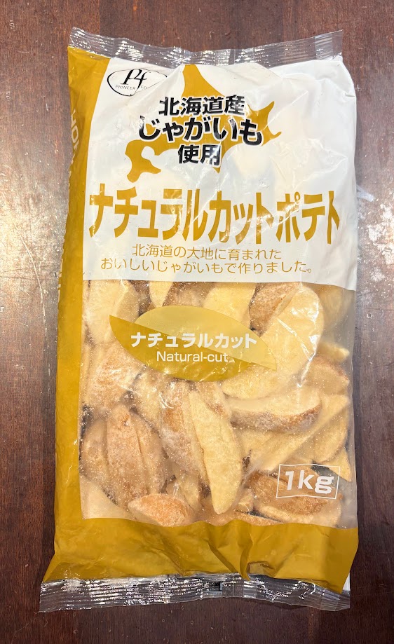 北海道産ジャガイモの皮付きカットのフライドポテト。 油で揚げる他、オーブントースター等で焼いてもOK。 原材料:ばれいしょ(北海道)、揚げ油(パーム油) 1㎏入