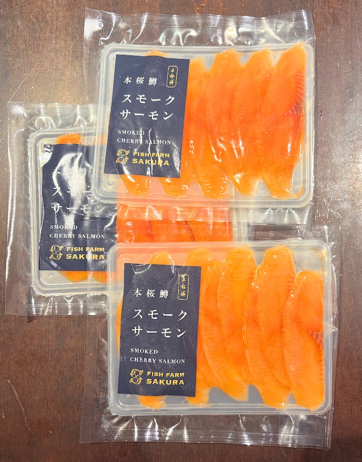 宮崎県産の本桜鱒を使用。 さくらのチップで丸一日「冷燻」仕上げ。サクラマス特有の上品な脂と、香ばしい燻製の薫りが美味。 添加物、着色剤、一切不使用。 スライス済みなので、解凍するだけ♪ オードブル、サラダ、お寿司など、食卓の彩りに。